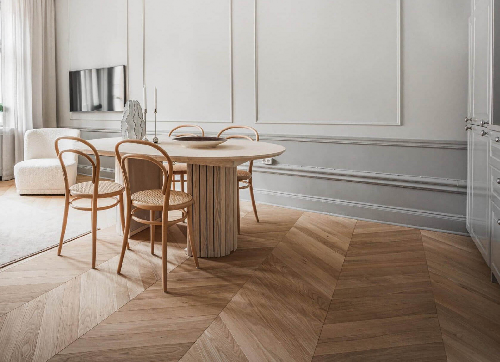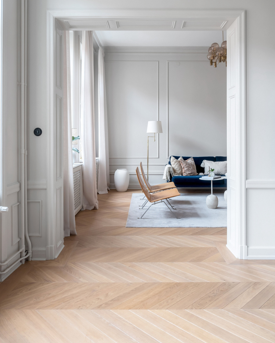 Французская елка получает широчайшее распространение и популярность: дизайнеры и архитекторы весьма умело используют её почти во всех типах интерьеров от классического до скандинавского стиля. Разные варианты размеров и соотношений сторон у плашек придают ей многогранность.