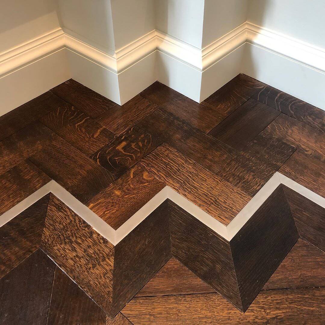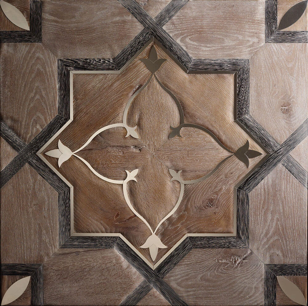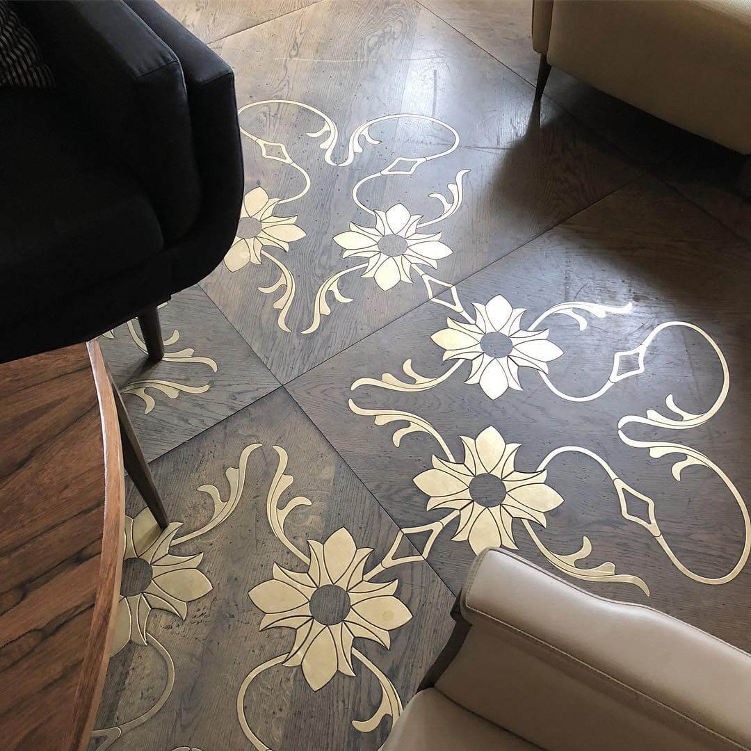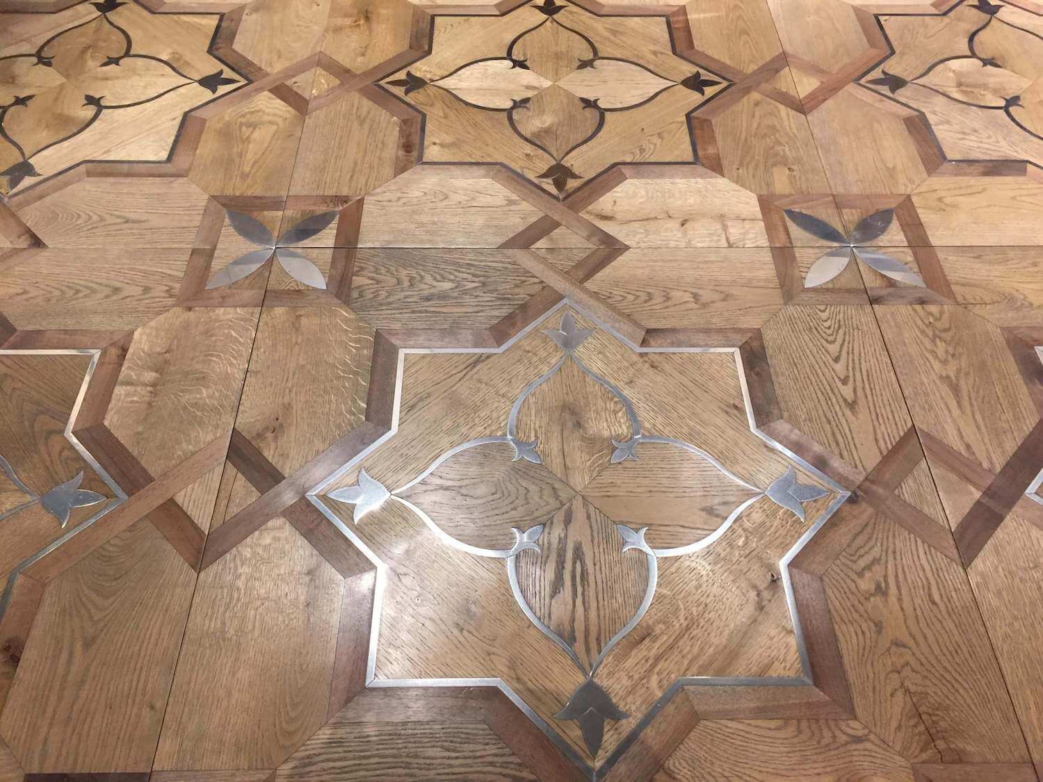 Помещение, в котором уложен паркет с металлическими вставками выходит из разряда просто помещений и становится предметом гордости своих хозяев, подчеркивая их респектабельность и вкус. Такие полы с годами не постареют, они станут произведением искусства. Вписать модули с металлом можно практически в любой интерьер, совершенно различной стилистикки, а грамотно подобранный бордюр станет подходящим обрамлением созданного великолепия. Мы работаем с различными металлами: паркет может быть с латунью, нержавеющей сталью, медью и другими вставками. Поверхность может быть отполирована до блеска или наоборот застарена.