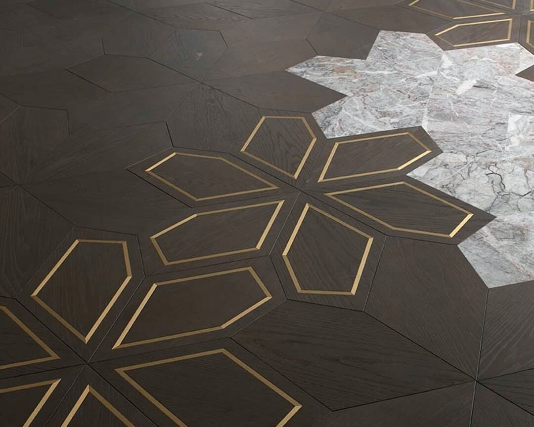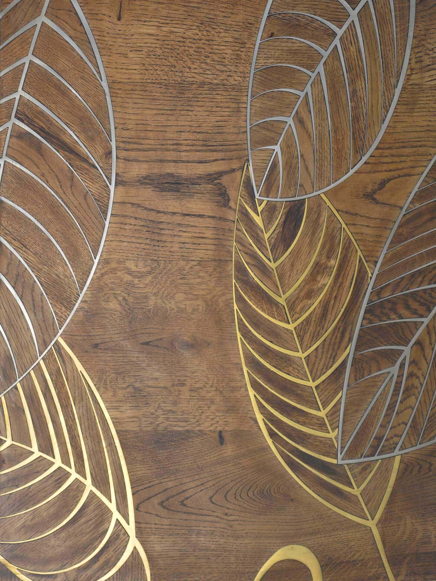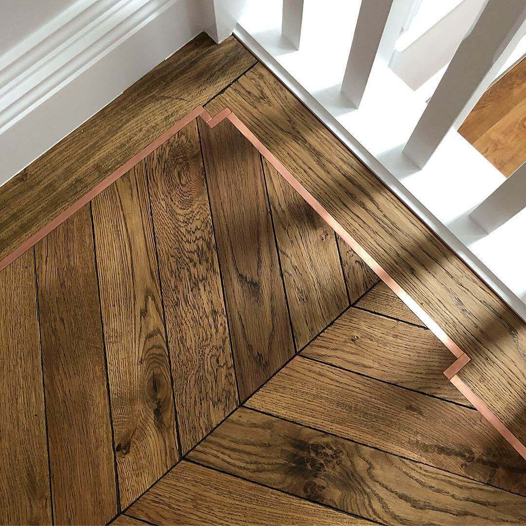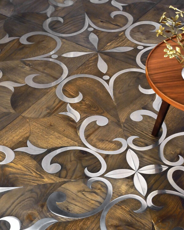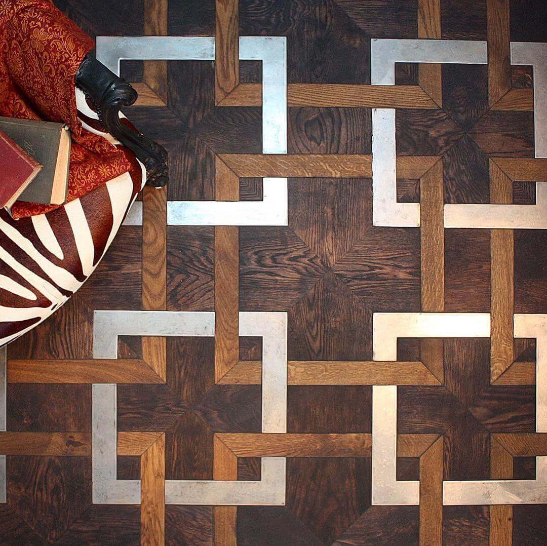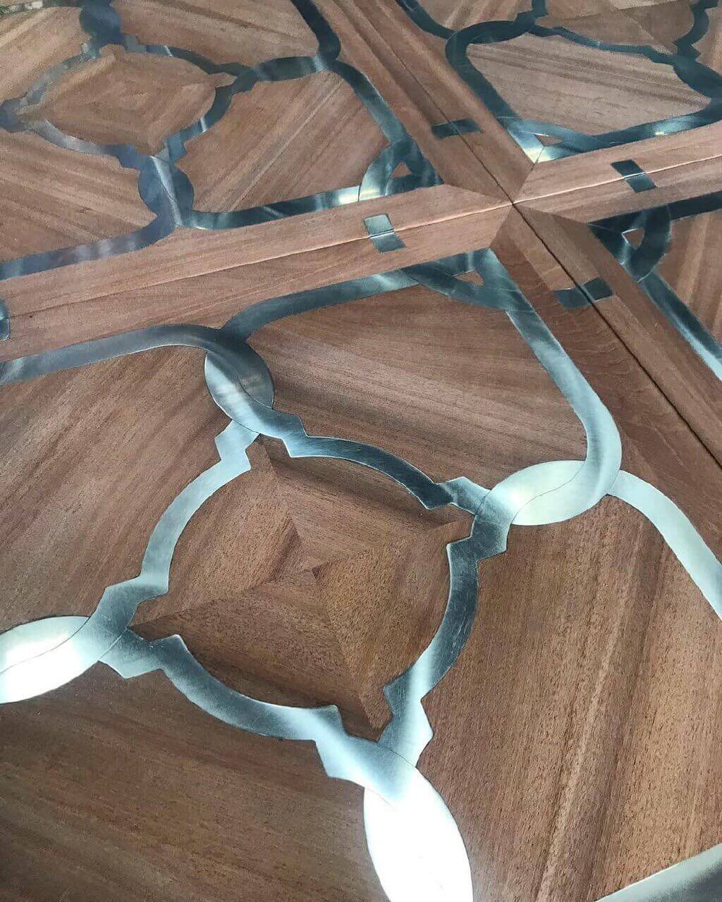 Помещение, в котором уложен паркет с металлическими вставками выходит из разряда просто помещений и становится предметом гордости своих хозяев, подчеркивая их респектабельность и вкус. Такие полы с годами не постареют, они станут произведением искусства. Вписать модули с металлом можно практически в любой интерьер, совершенно различной стилистикки, а грамотно подобранный бордюр станет подходящим обрамлением созданного великолепия. Мы работаем с различными металлами: паркет может быть с латунью, нержавеющей сталью, медью и другими вставками. Поверхность может быть отполирована до блеска или наоборот застарена.